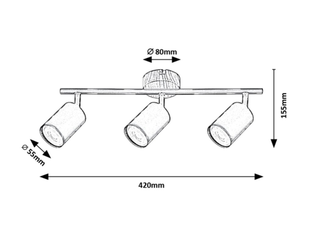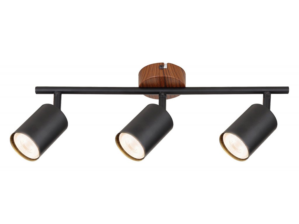 Třížárovkové bodové svítidlo Rabalux Edmund vyniká kombinací černého kovu a dekorativní základny v dubovém provedení. Tři flexibilní hlavy svítidla s paticemi GU10 jsou upevněny na kovové tyči, díky čemuž lze světlo snadno nasměrovat podle potřeby.