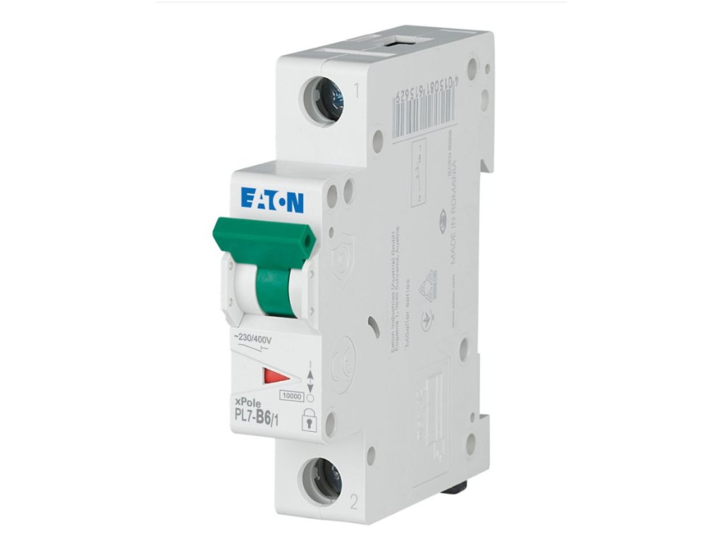Jistič Eaton PL7-B6/1 (6 A, char. B) – jednopólový jistič určený pro ochranu světelných a zásuvkových obvodů před přetížením a zkratem. Vypínací schopnost 10 kA, připojení vodičů 1–25 mm², montáž na DIN lištu, krytí IP20..