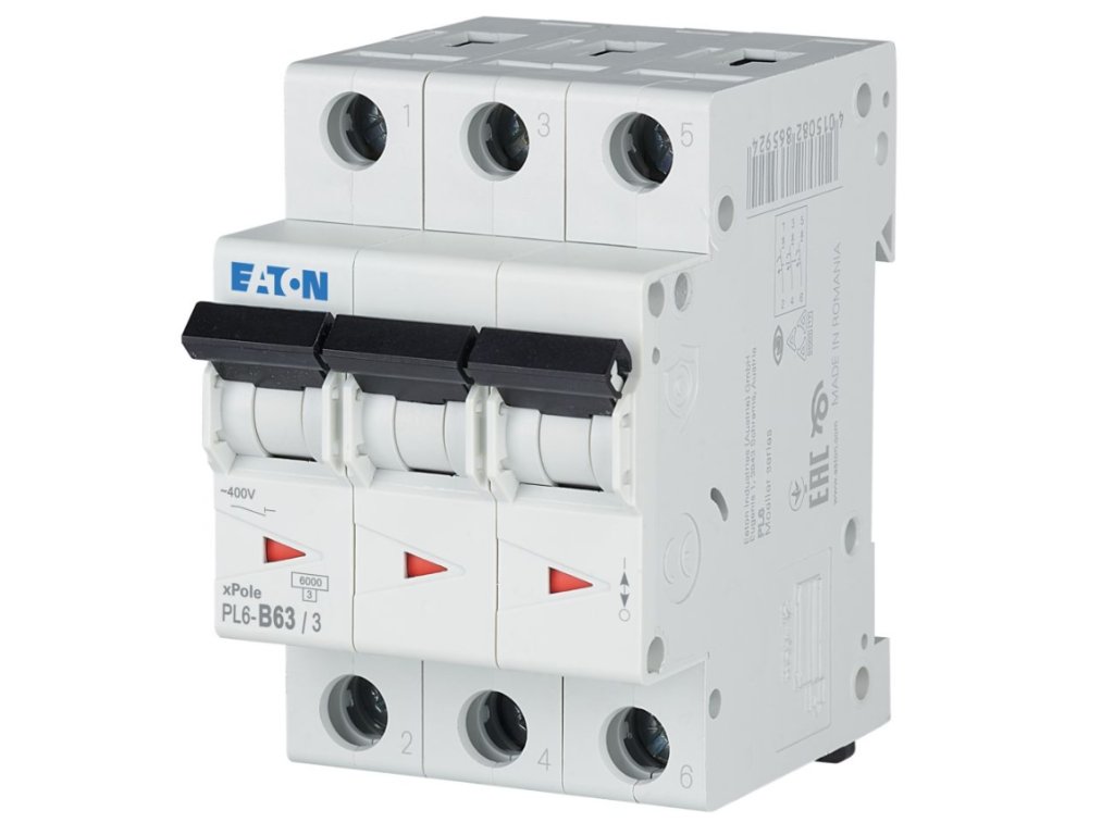 EATON PL6-B63/3 (286595) – třípólový jistič 63 A chrání třífázové obvody před přetížením a zkratem. Kompaktní provedení (3 moduly), vysoká odolnost 6 kA a spolehlivá kvalita značky EATON.