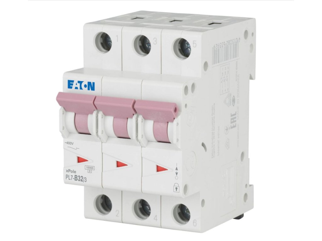 EATON PL7-B32/3 (263392) – třípólový jistič 32 A chrání třífázové obvody před přetížením a zkratem. Kompaktní provedení (3 moduly), vysoká odolnost 10 kA a spolehlivá kvalita značky EATON.