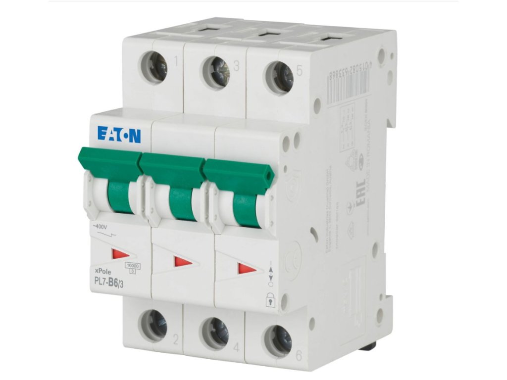 EATON PL7-B6/3 (263386) – třípólový jistič 6 A chrání třífázové obvody před přetížením a zkratem. Kompaktní provedení (3 moduly), snadná montáž na DIN lištu a vysoká zkratová odolnost (10 kA).