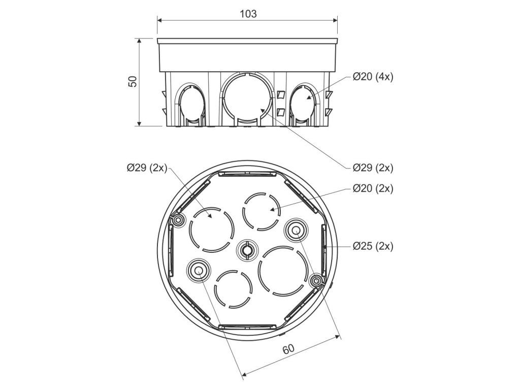 Odbočná elektroinstalační krabice KO 97/5 s víčkem je určena pro bezpečné a přehledné zapojení elektrických obvodů do 400 V / 16 A. Nabízí dostatečný prostor pro svorkovnice i složitější instalace, čemuž napomáhá i velké množství vstupů. Speciální výstupky zabraňují vytržení krabice ze zdi, což zajišťuje spolehlivou fixaci při montáži do zdiva.
