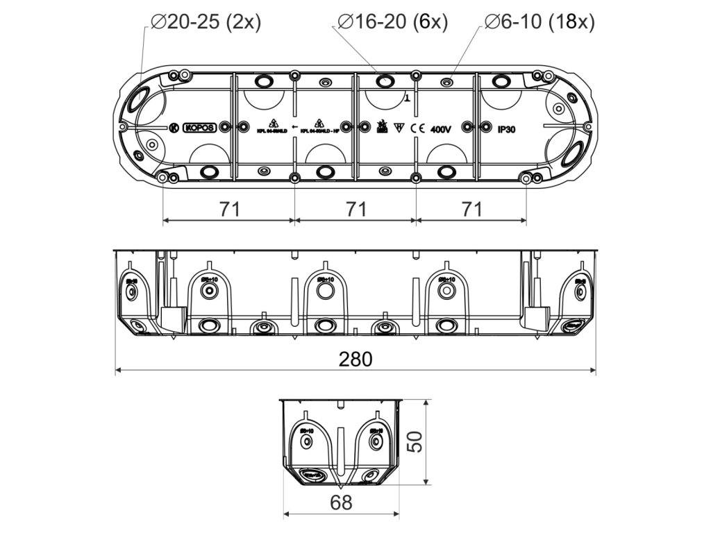 Odbočná elektroinstalační krabice KPL 64-50/4LD NA je určena pro bezpečné a přehledné zapojení elektrických obvodů do 400 V / 16 A. Nabízí dostatečný prostor pro svorkovnice i složitější instalace, čemuž napomáhá i velké množství vstupů. Speciální výstupky zabraňují vytržení krabice ze zdi, což zajišťuje spolehlivou fixaci při montáži do zdiva.