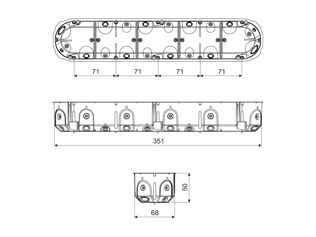Odbočná elektroinstalační krabice KPL 64-50/5LD_NA je určena pro bezpečné a přehledné zapojení elektrických obvodů do 400 V / 16 A. Nabízí dostatečný prostor pro svorkovnice i složitější instalace, čemuž napomáhá i velké množství vstupů. Speciální výstupky zabraňují vytržení krabice ze zdi, což zajišťuje spolehlivou fixaci při montáži do zdiva.
