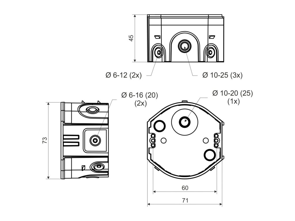Odbočná elektroinstalační krabice KP 68/D KA je určena pro bezpečné a přehledné zapojení elektrických obvodů do 400 V / 16 A. Nabízí dostatečný prostor pro svorkovnice i složitější instalace, čemuž napomáhá i velké množství vstupů. Speciální výstupky zabraňují vytržení krabice ze zdi, což zajišťuje spolehlivou fixaci při montáži do zdiva.