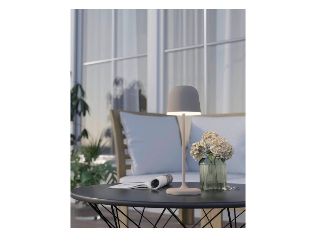 Stolní lampa MANNERA spojuje elegantní design s praktičností. Vestavěný Li-ion akumulátor ji umožňuje používat i tam, kde není zásuvka, například na terase nebo zahradě. Krytí IP54 ji chrání před deštěm, LED technologie zajišťuje nízkou spotřebu (2,2 W) a akumulátor s kapacitou 1800 mAh vydrží svítit teplým světlem celý večer.