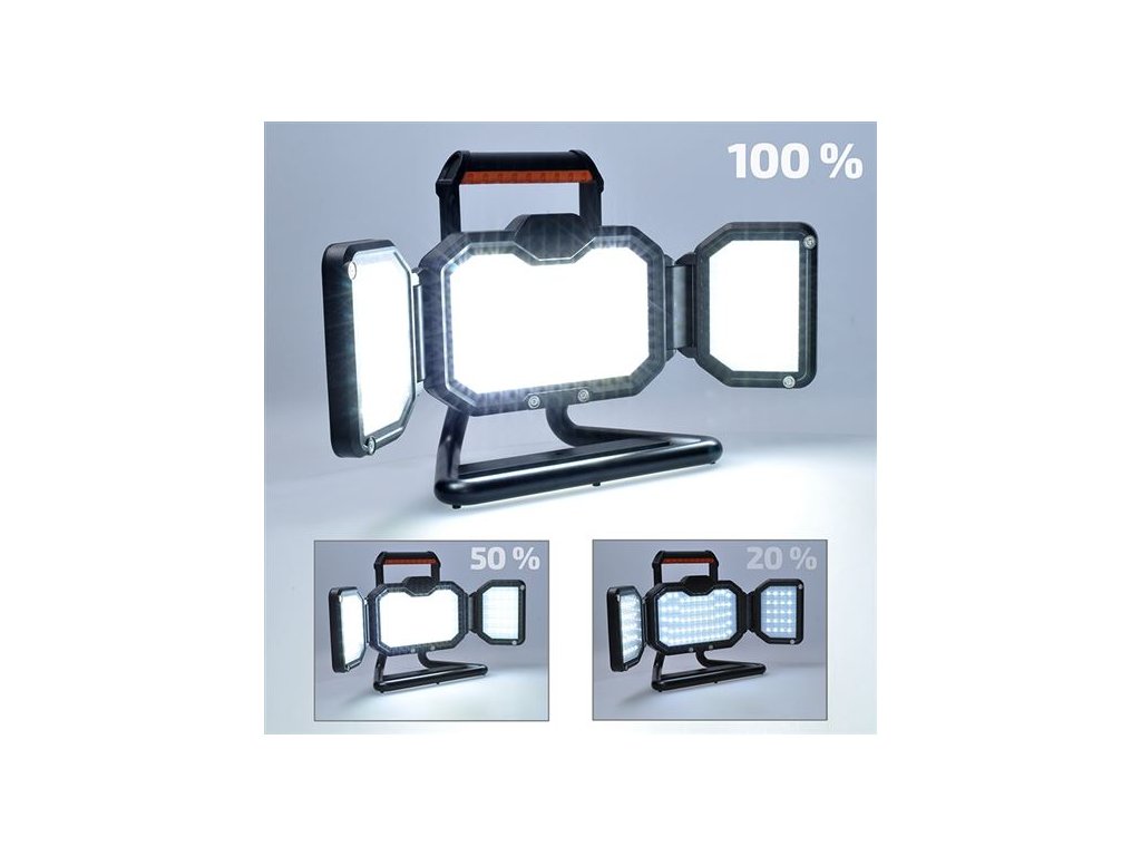 Výkonný a mobilní reflektor s výkonem 30 W, světelným tokem až 3000 lm a integrovanou Li-Ion baterií 6000 mAh. Nabízí tři režimy svícení (100 % / 50 % / 20 %) s výdrží až 10 hodin na jedno nabití. Díky neutrální bílé barvě světla (4000 K), širokému úhlu svitu 120° a 60 SMD LED čipům poskytuje silné a rovnoměrné osvětlení.