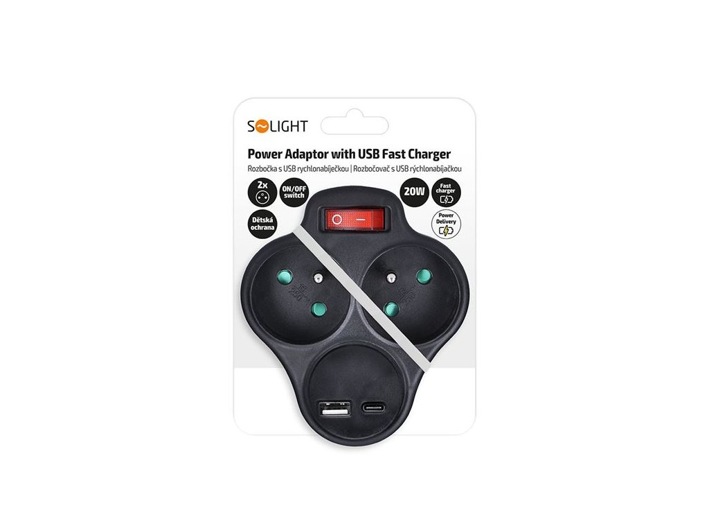 Rozbočka s USB A+C rychlonabíječkou 2x zásuvky 10A s vypínačem P99B-PD20, černá - SOLIGHT
