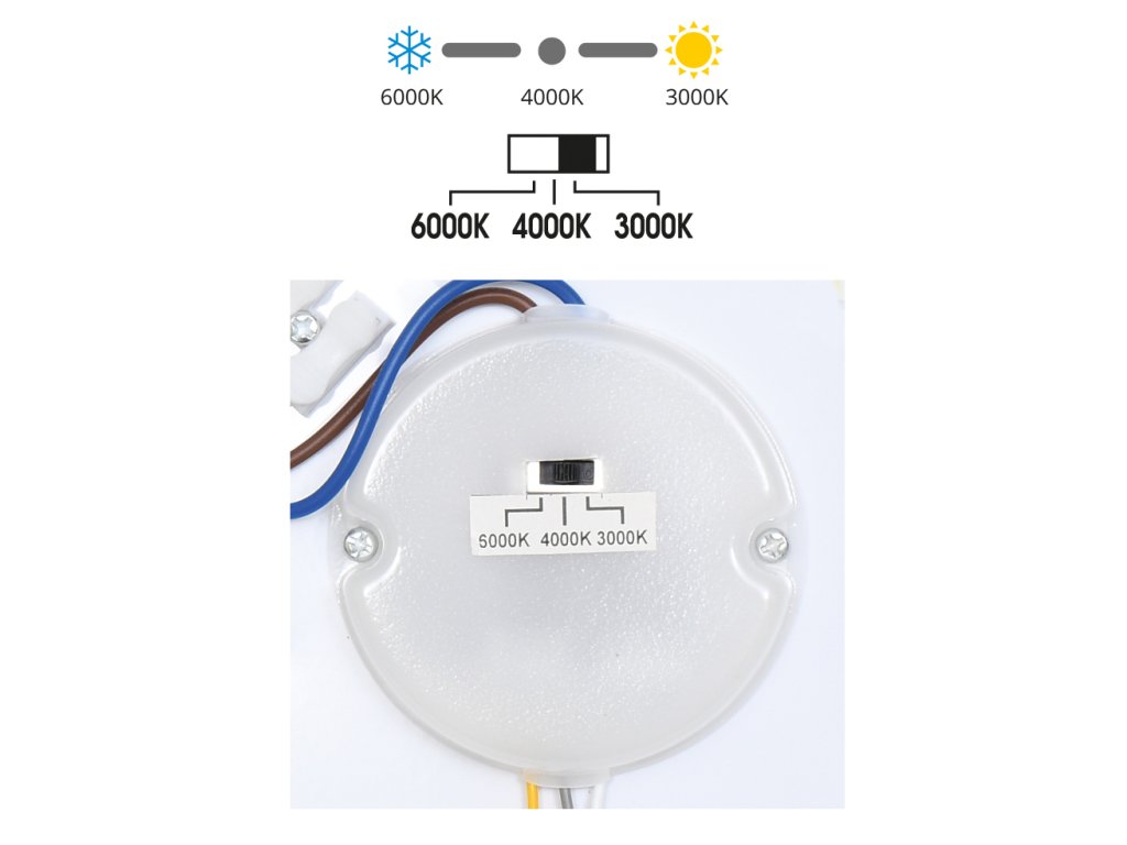 Stropní svítidlo LINA z plastu a kovu je dostupné v různých výkonnostních variantách. Praktický DIP přepínač umožňuje nastavit teplotu světla na 3000K, 4000K nebo 6000K podle vašich potřeb.